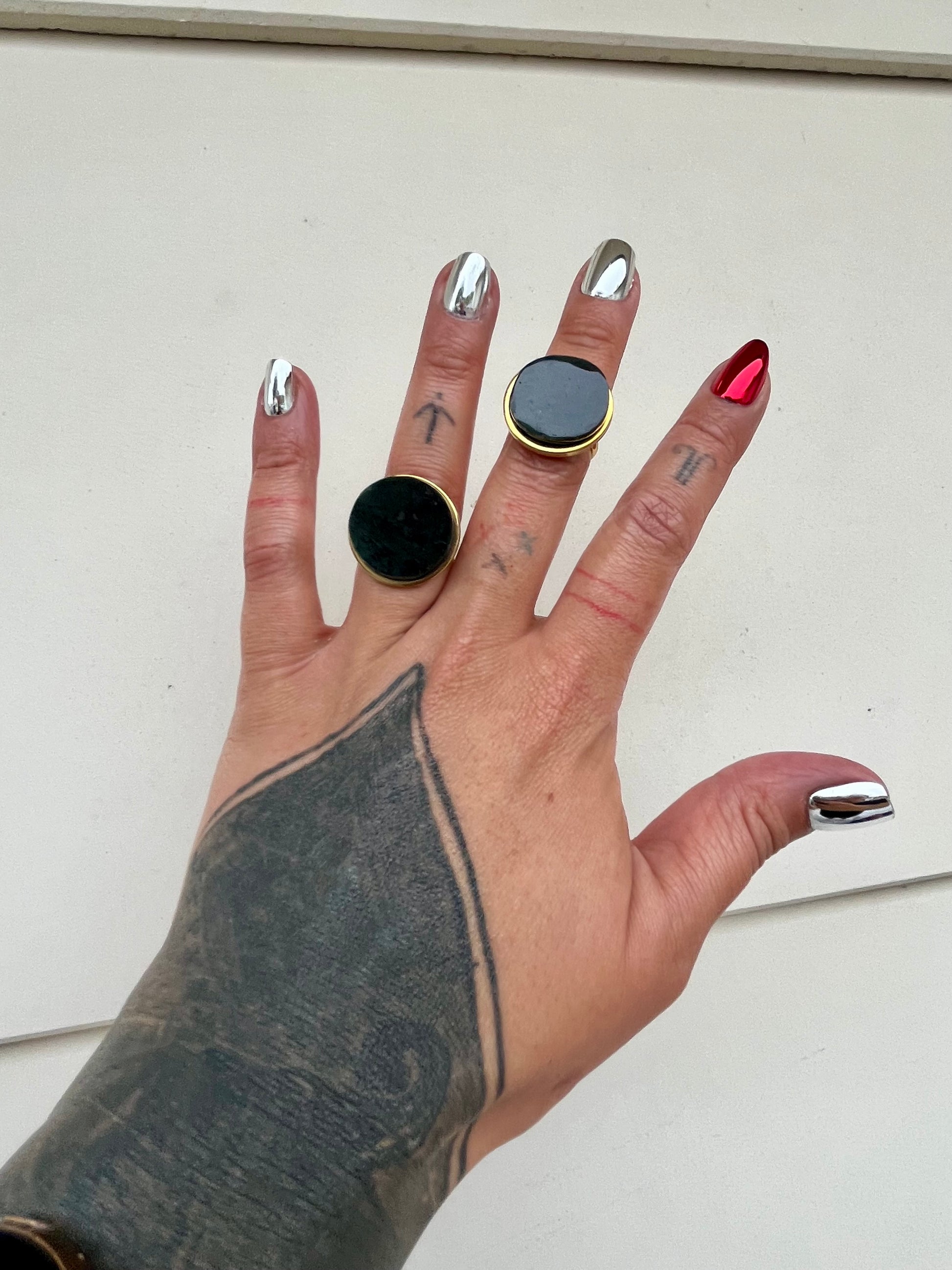 • 18k gold plated and adjustable rīngi base set with 20mm circumference hand carved NZ Pounamu