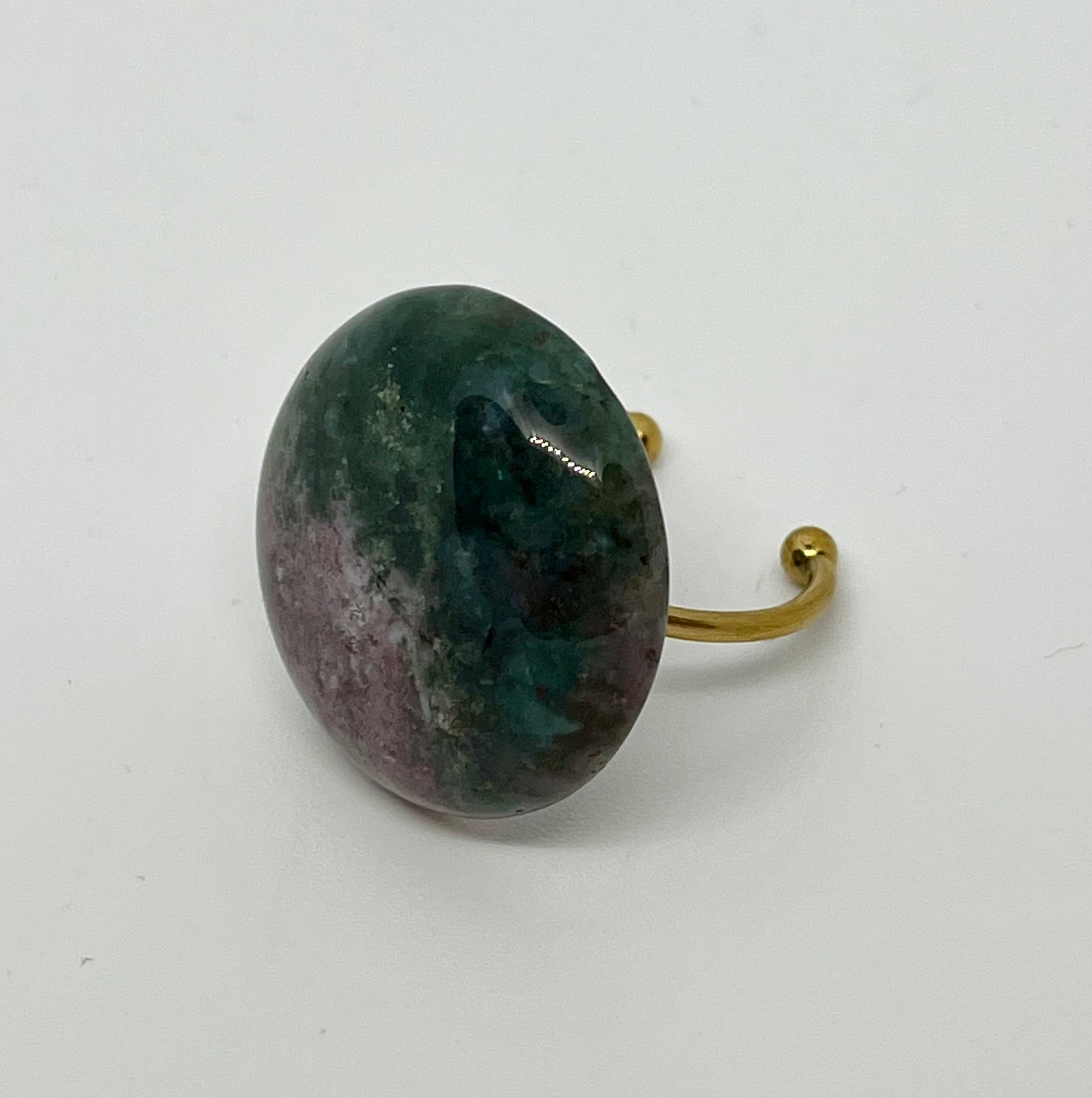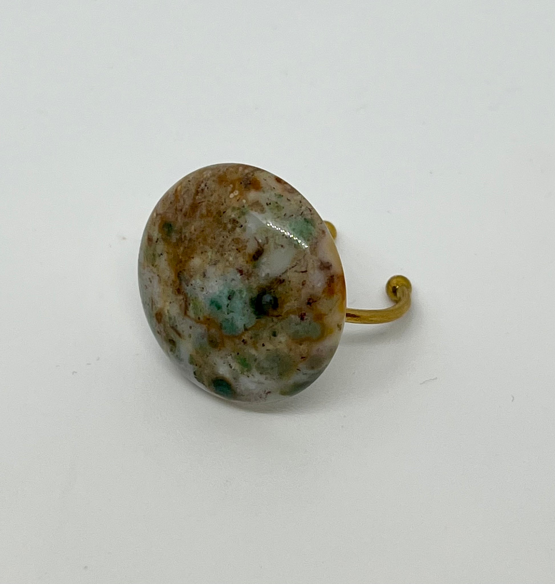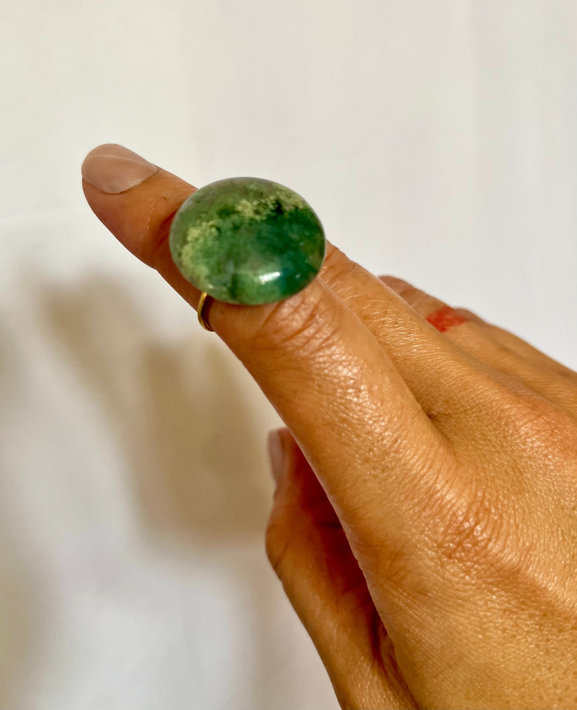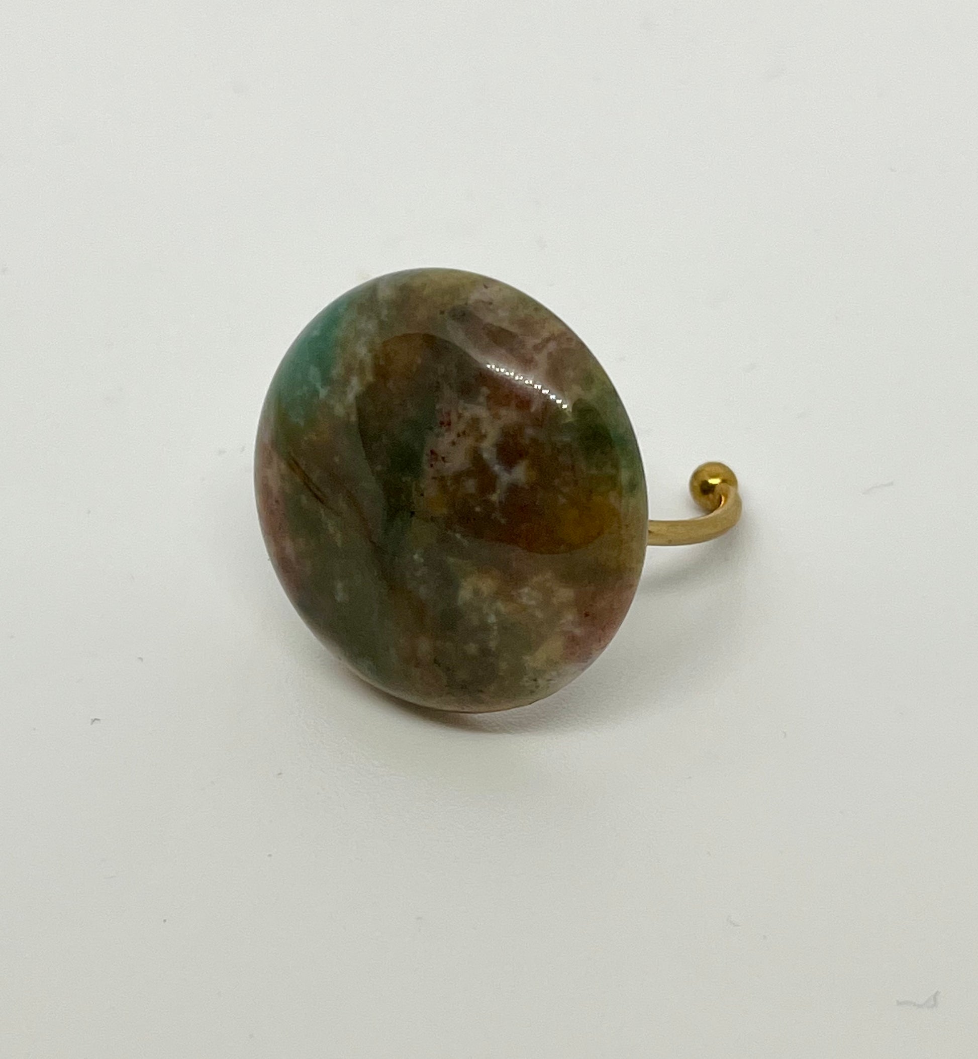 • 20mm hand crafted African Jade disk, set on 18k gold plated adjustable ring base.