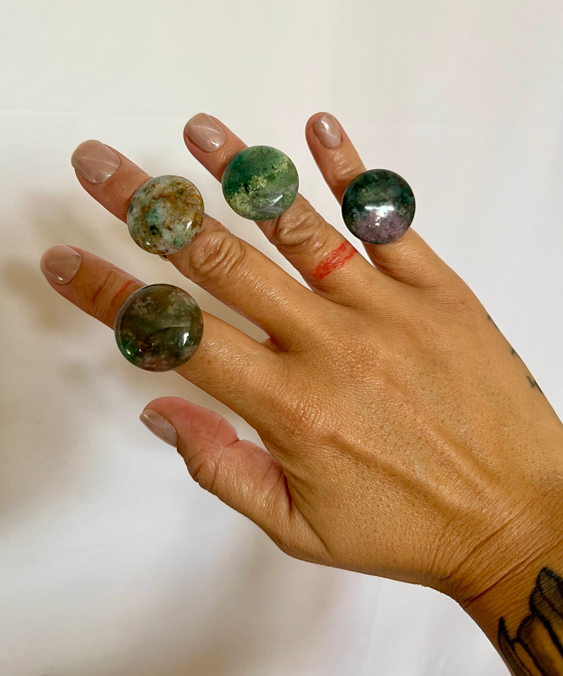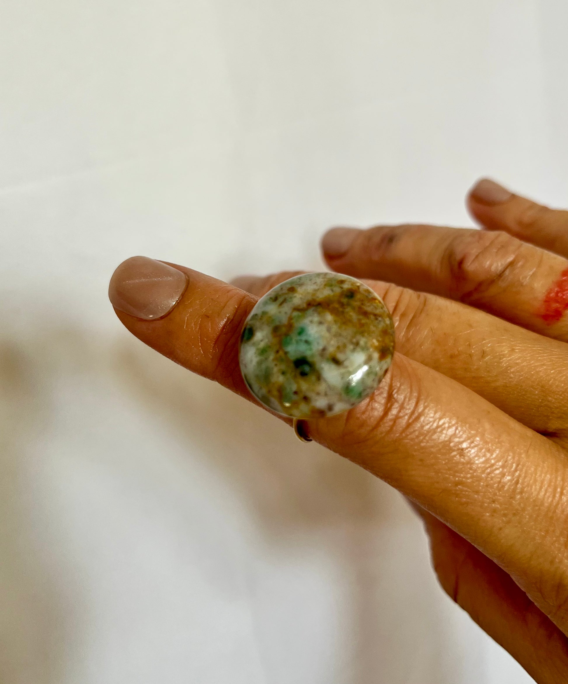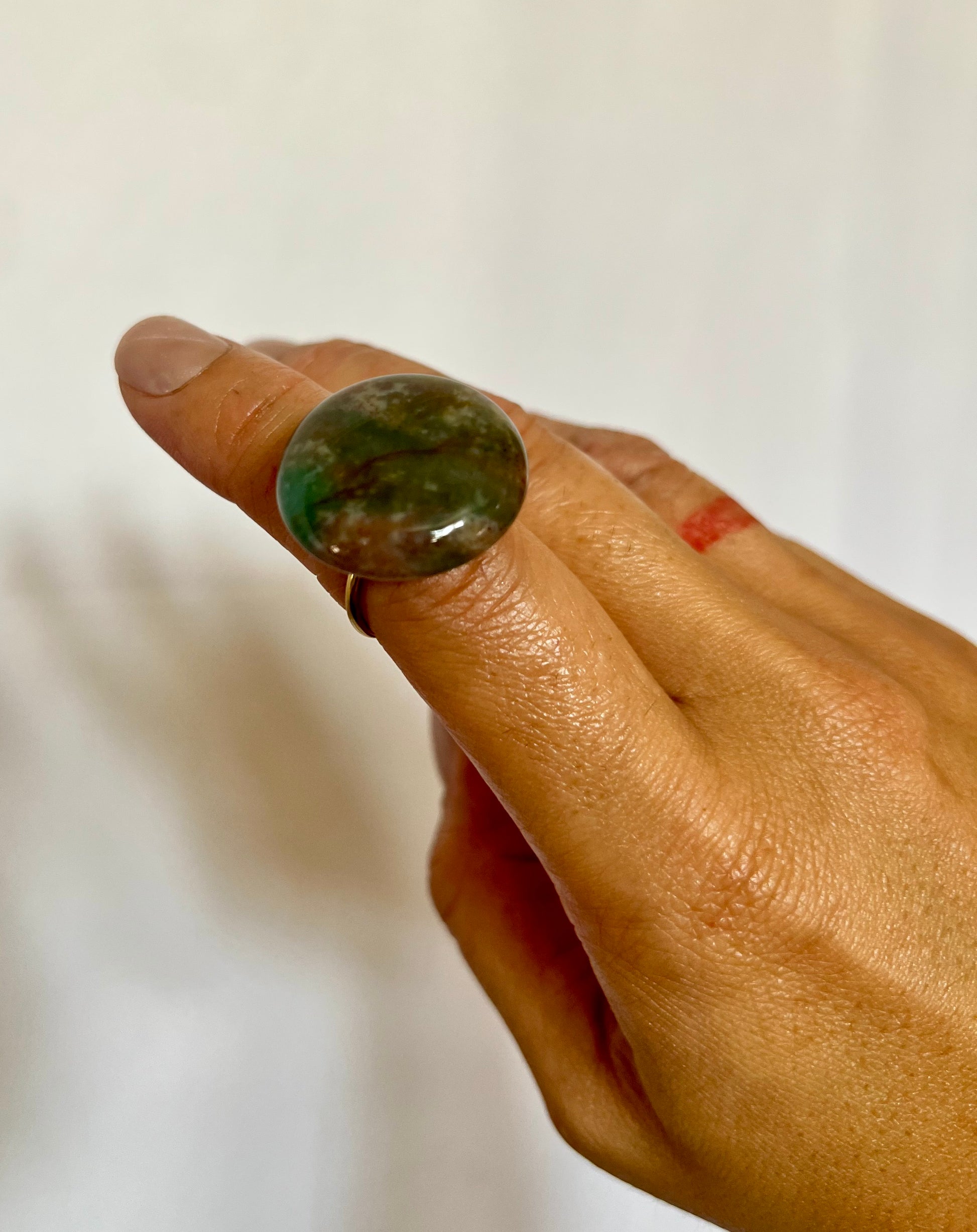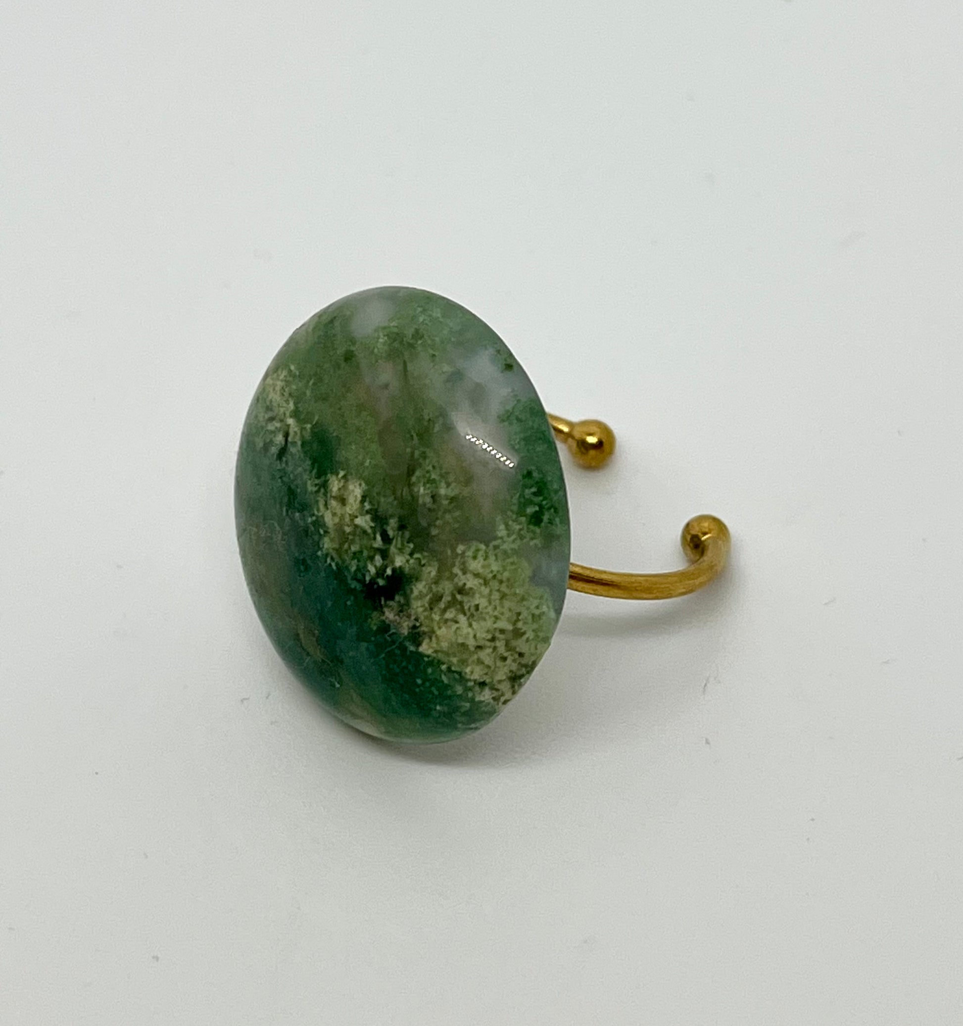 • 20mm hand crafted African Jade disk, set on 18k gold plated adjustable ring base.