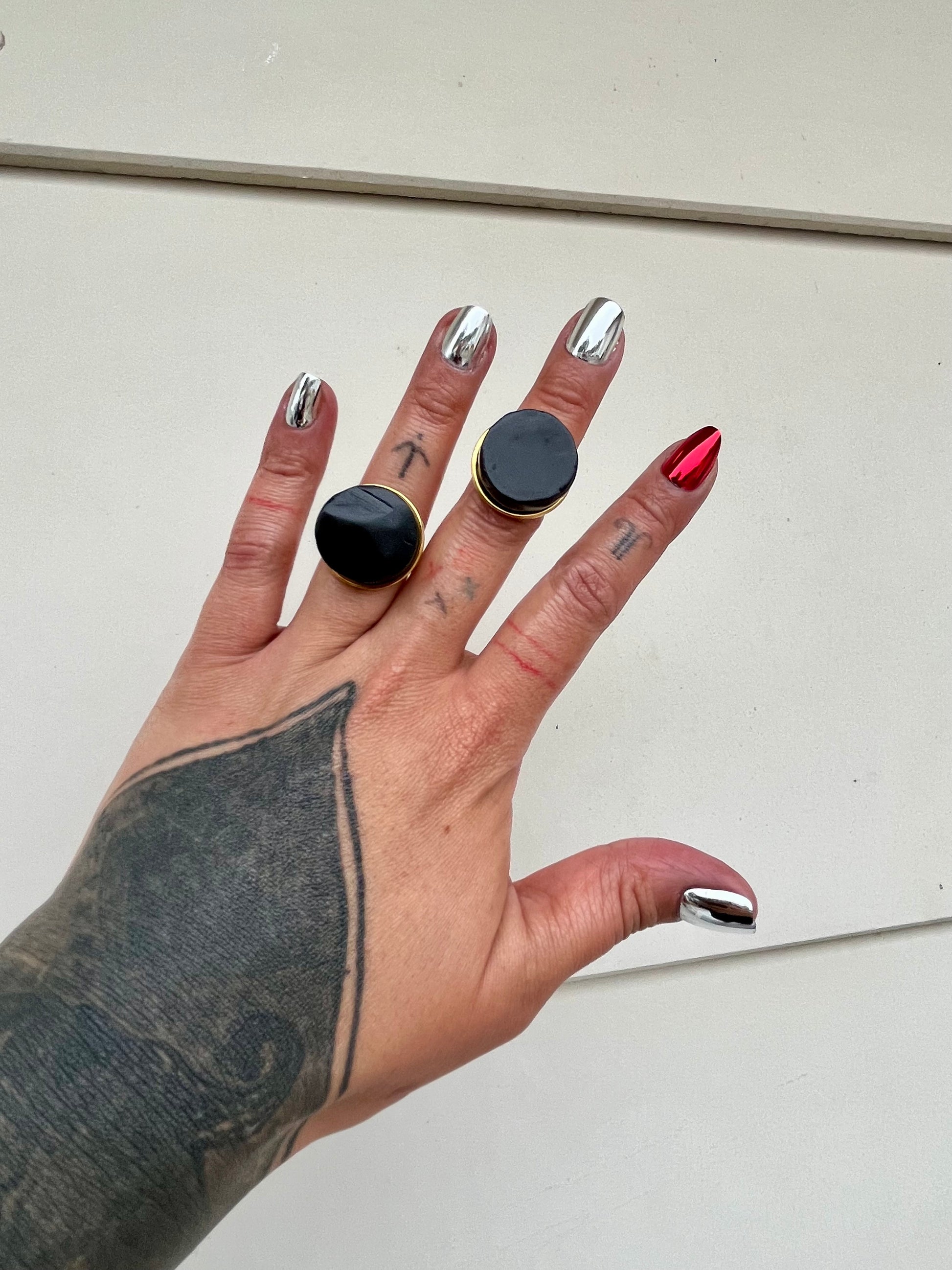 • 18k gold plated and adjustable rīngi base set with 20mm Circumference hand carved tūhua (Black obsidian)